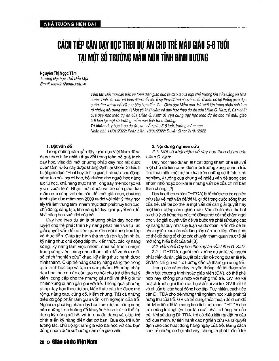 Cách tiếp cận dạy học theo dự án cho trẻ mẫu giáo 5-6 tuổi tại một số trường mầm non tỉnh Bình Dương = Project-based learning approach for preschool children of 5-6 years old in some preschools in Binh Duong province