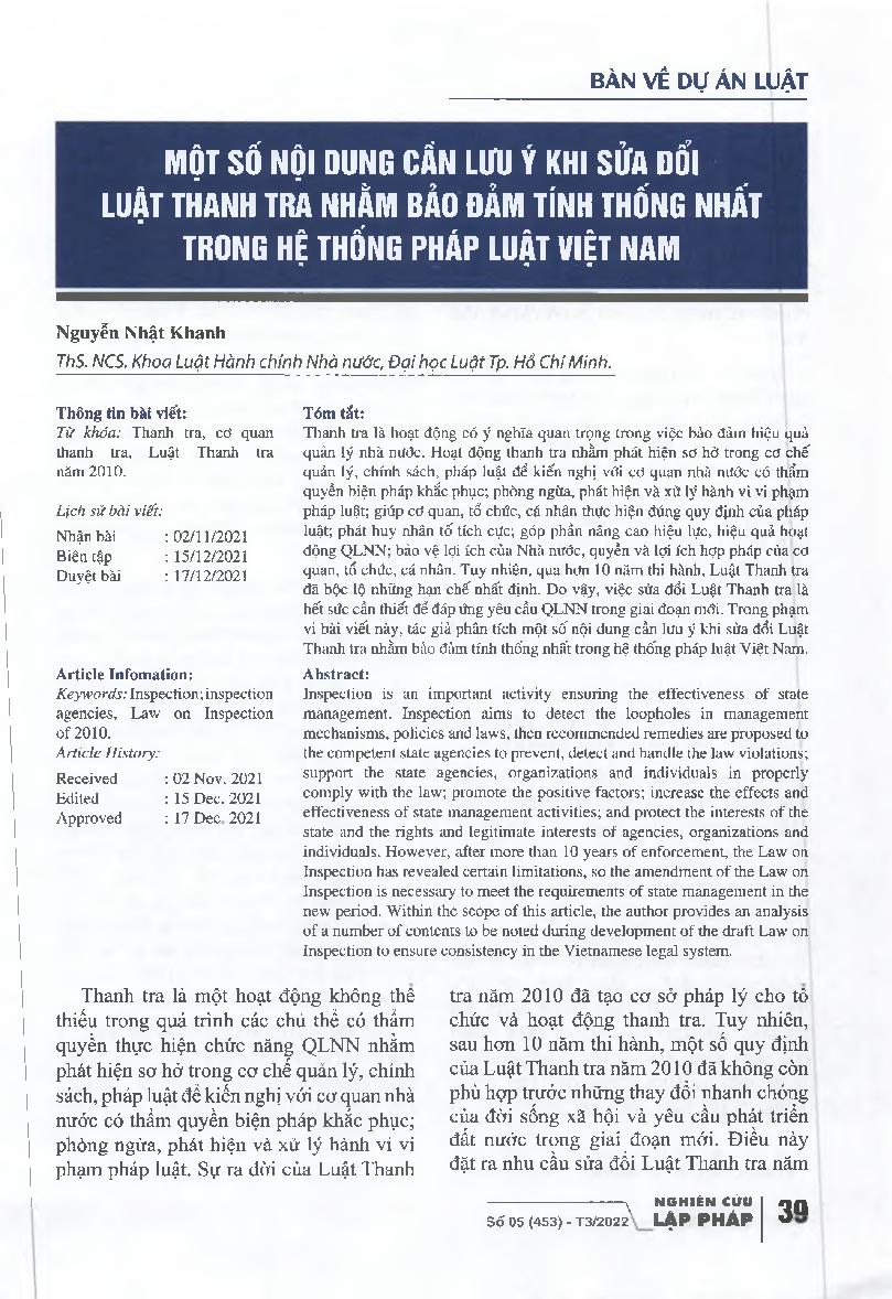Một số nội dung cần lưu ý khi sửa đổi luật thanh tra nhằm bảo đảm tính thống nhất trong hệ thống pháp luật Việt Nam = Some things to keep in mind when amending the inspection law to ensure consistency in the Vietnamese legal system