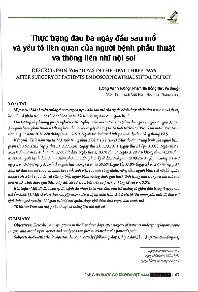 Thực trạng đau ba ngày đầu sau mổ và yếu tố liên quan của nguời bệnh phẫu thuật vá thông liên nhĩ nội soi = Describe pain symptoms in the first three days after surgery of patients endoscopic atrial septal defect