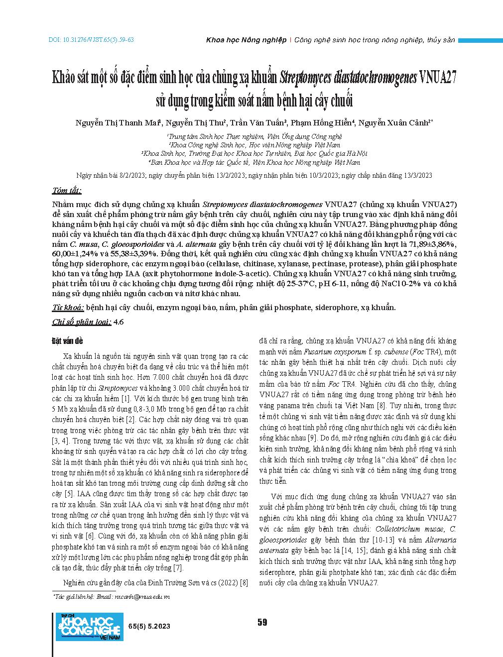Khảo sát một số đặc điểm sinh học của chủng xạ khuẩn Streptomyces diastatochromogenes VNUA27 sử dụng trong kiểm soát nấm bệnh hại cây chuối = Characterisation of Streptomyces diastatochromogenes VNUA27 used for controlling fungal pathogens causing banana