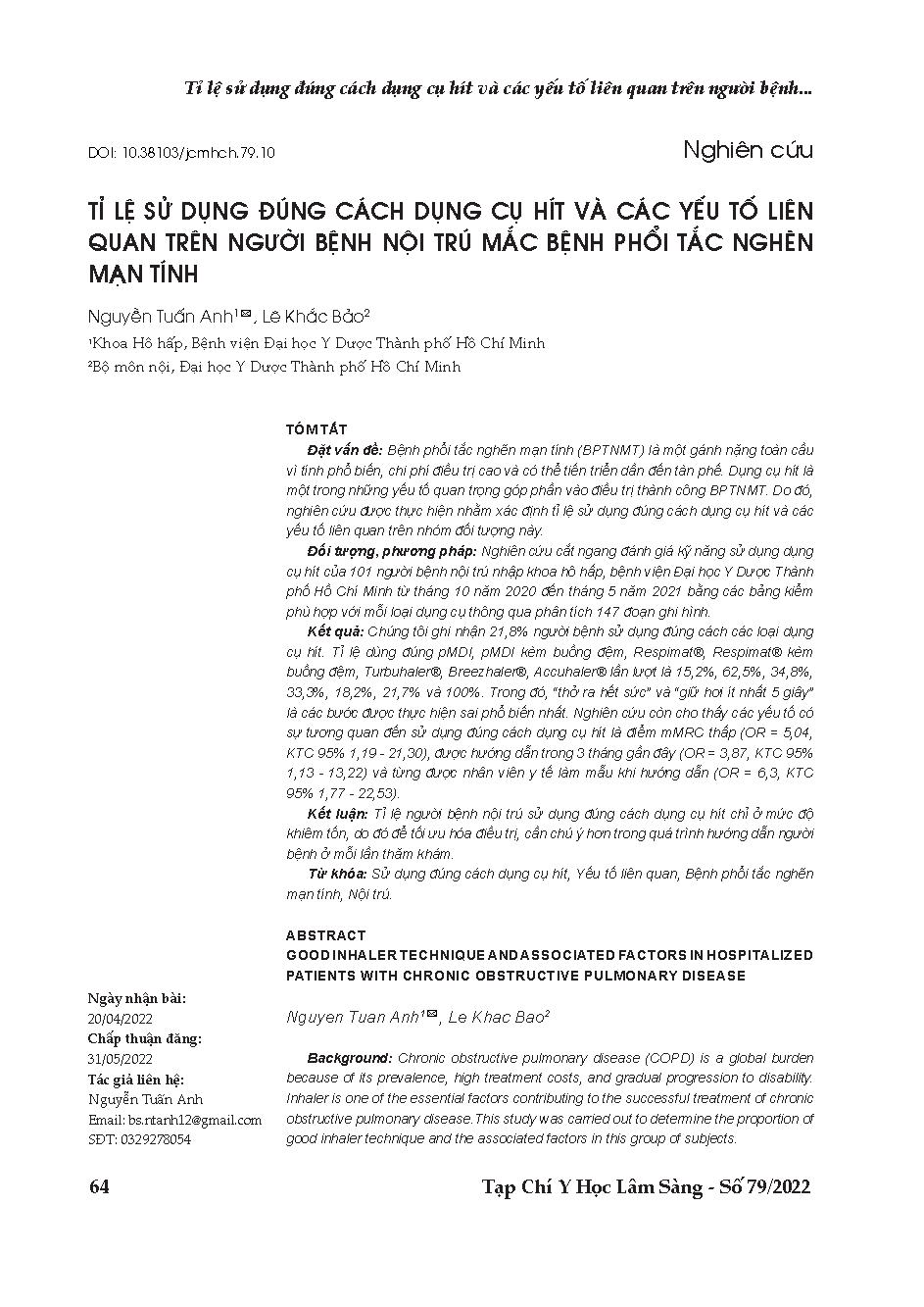 Tỉ lệ sử dụng đúng cách dụng cụ hít và các yếu tố liên quan trên người bệnh nội trú mắc bệnh phổi tắc nghẽn mạn tính = Good inhaler technique and associated factors in hospitalized patients with chronic obstructive pulmonary disease