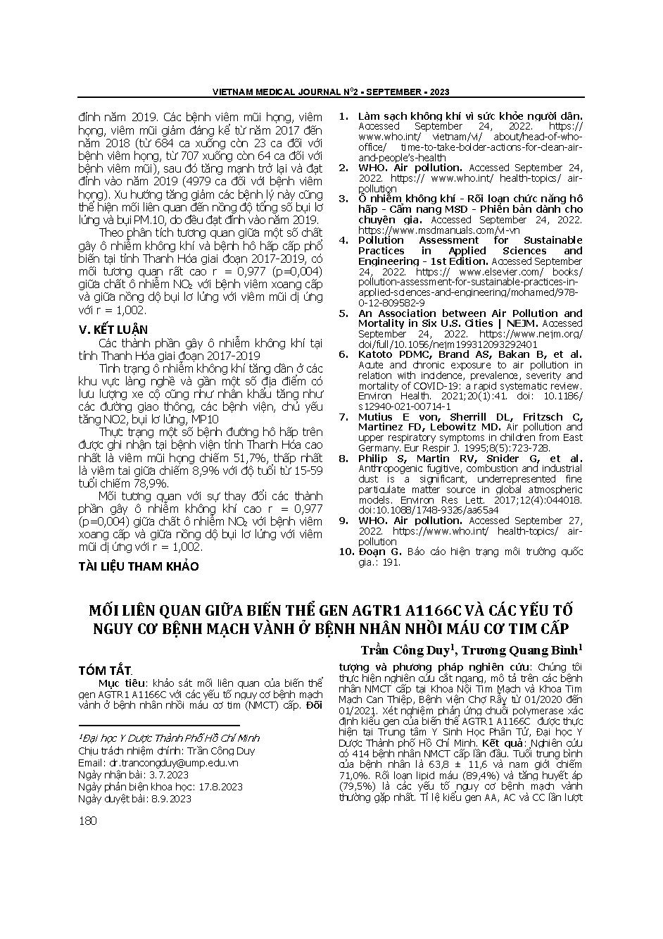 Mối liên quan giữa biến thể gen agtr1 a1166c và các yếu tố nguy cơ bệnh mạch vành ở bệnh nhân nhồi máu cơ tim cấp = Association between agtr1 a1166c genetic polymorphism and coronary artery disease risk factors in patients with acute myocardial infarction