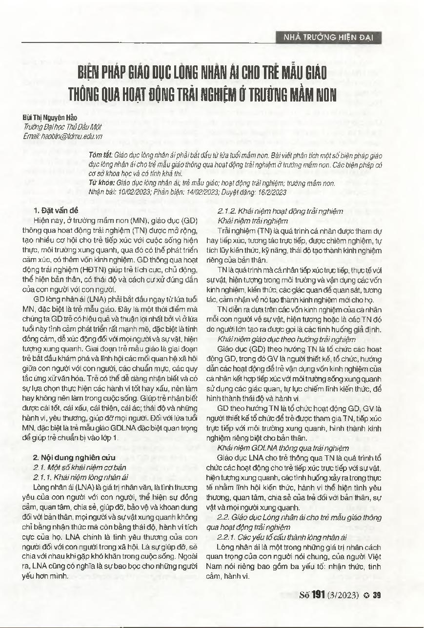 Biện pháp giáo dục lòng nhân ái cho trẻ mẫu giáo thông qua hoạt động trải nghiệm ở trường mầm non = Measures to educate kindness for preschool children through experiential activities at preschool