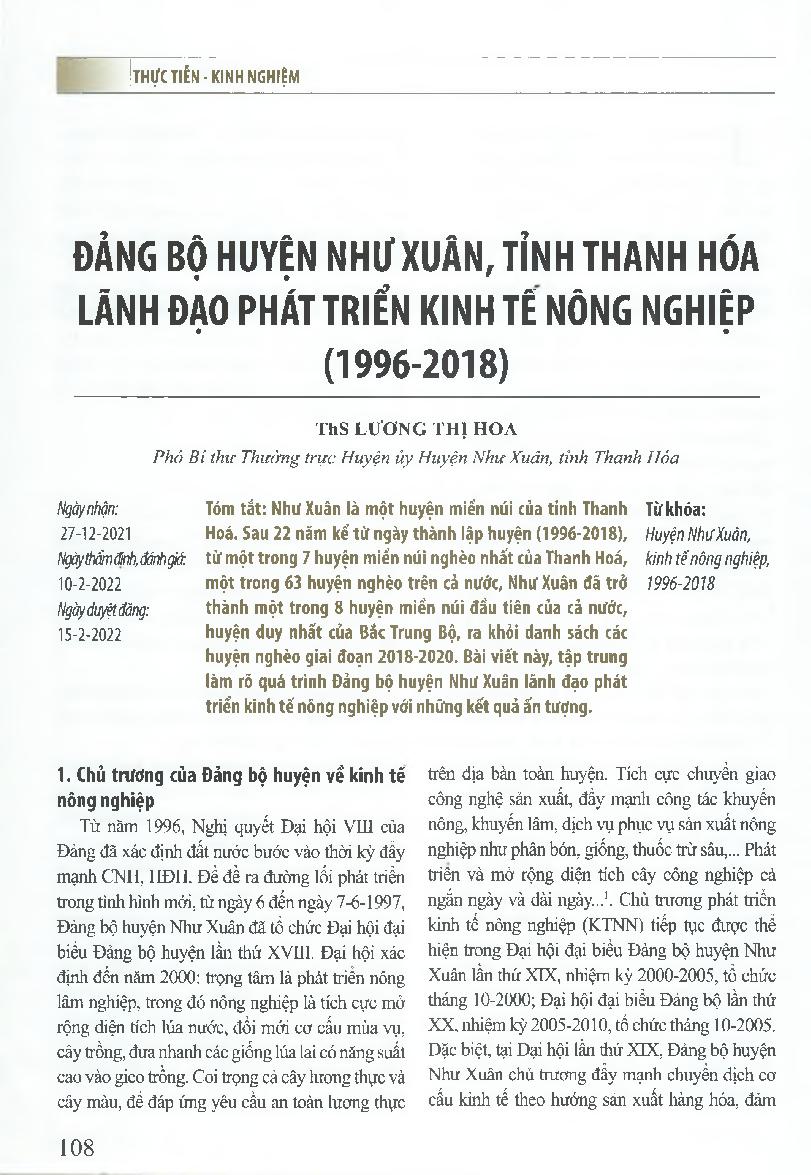 Đảng bộ huyện Như Xuân, tỉnh Thanh Hóa lãnh đạo phát triển kinh tế nông nghiệp (1996-2018)