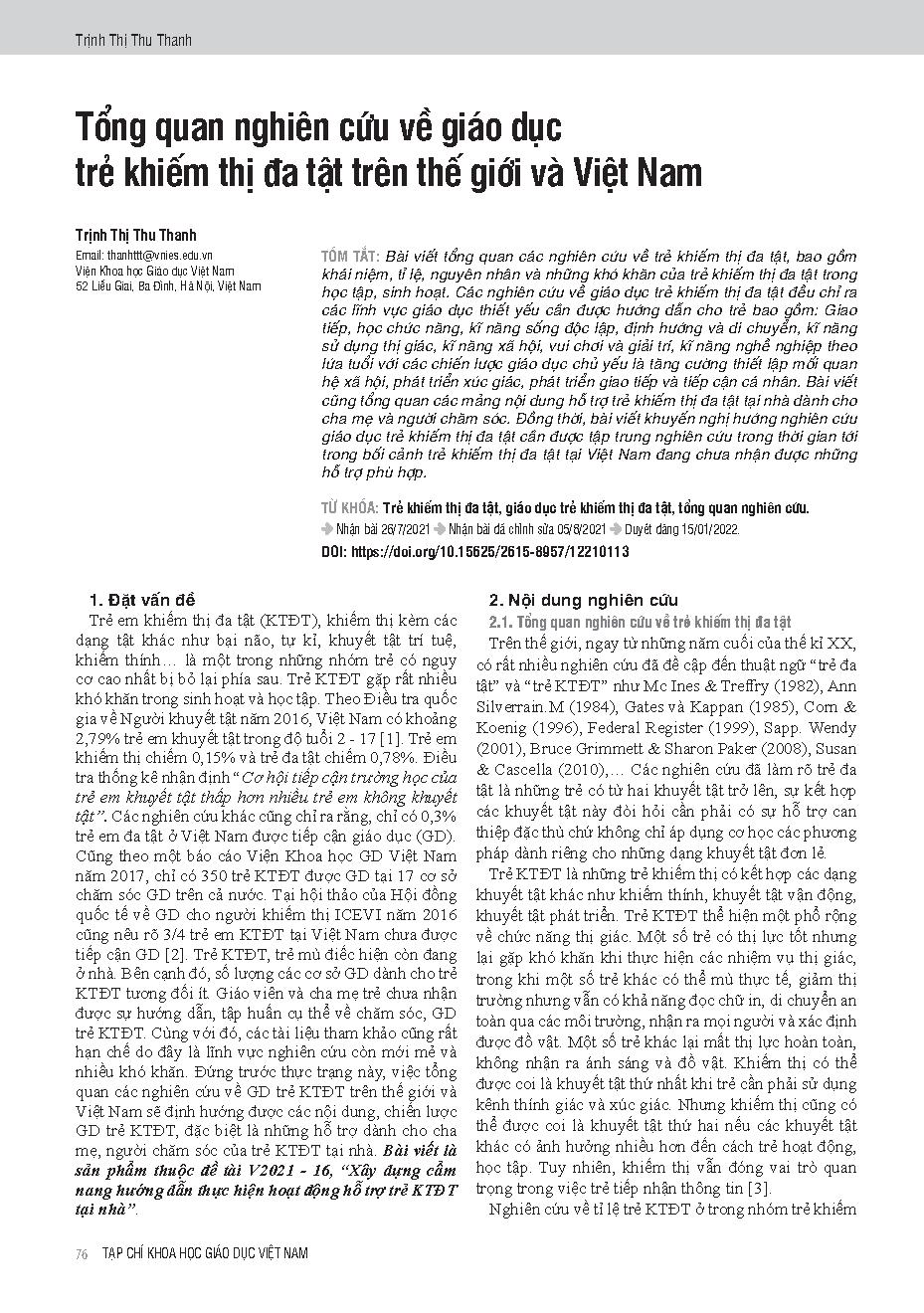 Tổng quan nghiên cứu về giáo dục trẻ khiếm thị đa tật trên thế giới và Việt Nam = An overview of research on education for children with visual impairment and multiple disabilities in the world and in Vietnam
