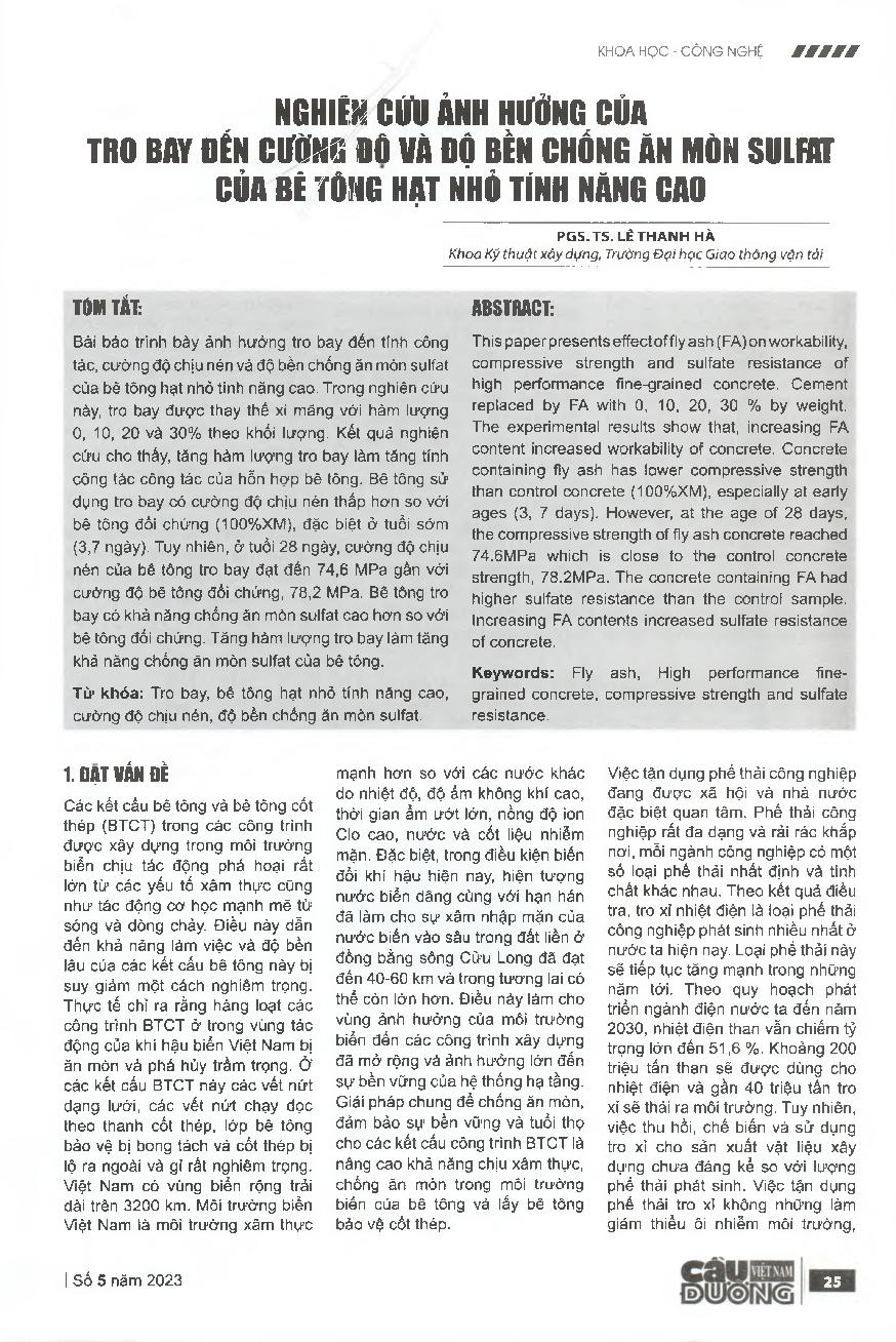 Nghiên cứu ảnh hưởng của tro bay đến cường độ và độ bền chống ăn môn sunfat của bê tông hạt nhỏ tính năng cao = Study on effect of fly ash on compressive strength and sulfate resistance of high performance fine-grained concrete
