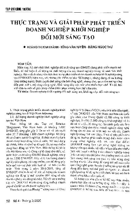 Thực trạng và giải pháp phát triển doanh nghiệp khởi nghiệp đổi mới sáng tạo = Current situation and solutions to promote the growth of creative innovation start-ups