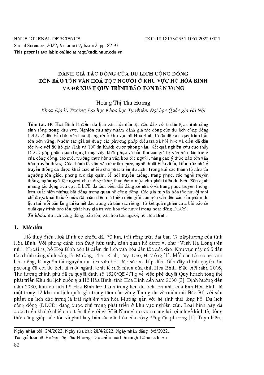 Đánh giá tác động của du lịch cộng đồng đến bảo tồn văn hoá tộc người ở khu vực hồ Hòa Bình và đề xuất quy trình bảo tồn bền vững = Assessing the impact of community-based tourism on ethnic culture preservation in Hoa Binh reservoir area and proposing sus