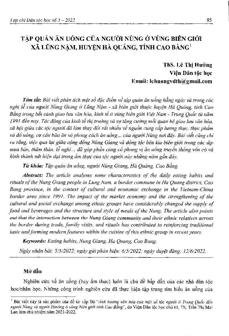 Tập quán ăn uống của người Nùng ở vùng biên giới xã Lũng Nặm, huyện Hà Quảng, tỉnh Cao Bằng = Eating habits of the Nung in the border area of Lung Nam commune, Ha Quang district, Cao Bang province