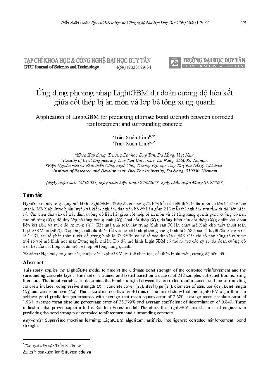Ứng dụng phương pháp LightGBM dự đoán cường độ liên kết giữa cốt thép bị ăn mòn và lớp bê tông xung quanh = Application of LightGBM for predicting ultimate bond strength between corroded reinforcement and surrounding concrete