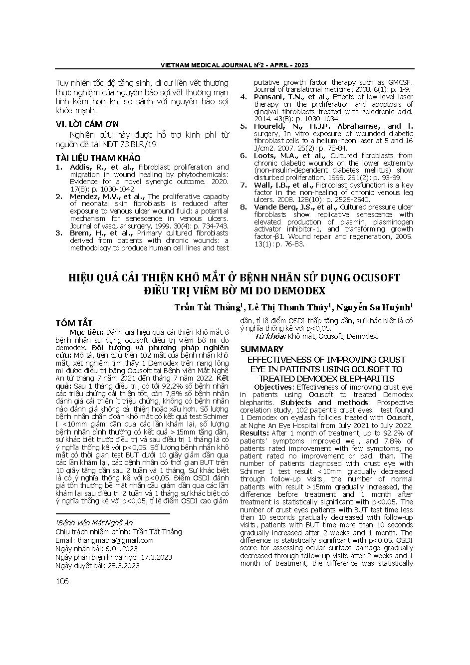 Hiệu quả cải thiện khô mắt ở bệnh nhân sử dụng Ocusoft điều trị viêm bờ mi do Demodex = Effectiveness of improving crust eye in patients using Ocusoft to treated Demodex blepharitis