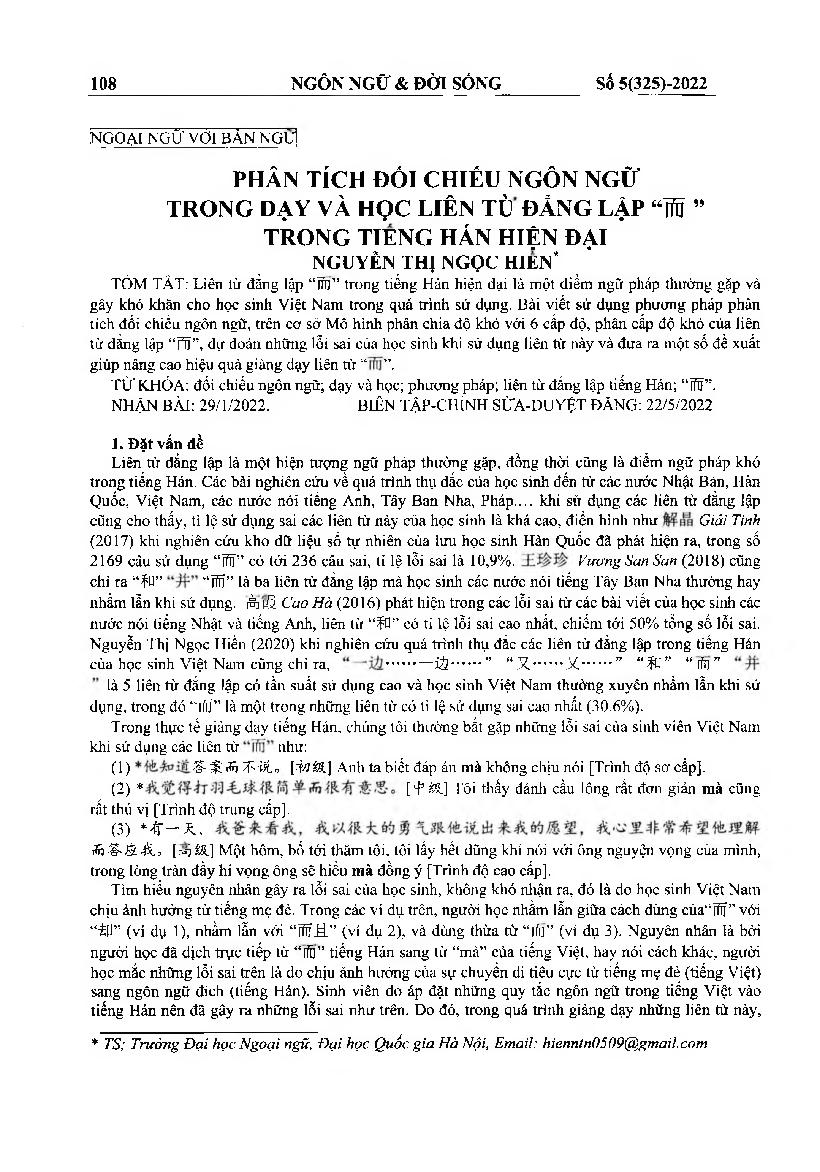 Phân tích đối chiếu ngôn ngữ trong dạy và học liên từ đẳng lập trong tiếng Hán hiện đại = Contrastive analysis in teaching and learning modern Chinese coordinating conjunction “ (nhi)”