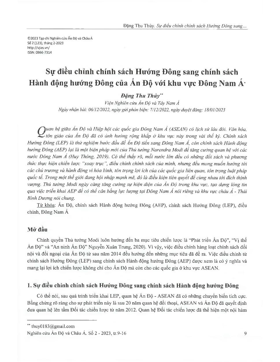 Sự điều chỉnh chính sách Hướng Đông sang chính sách Hành động hướng Đông của Ấn Độ với khu vực Đông Nam Á = India's adjustment from Look East Policy to Act East Policy towards Southeast Asia