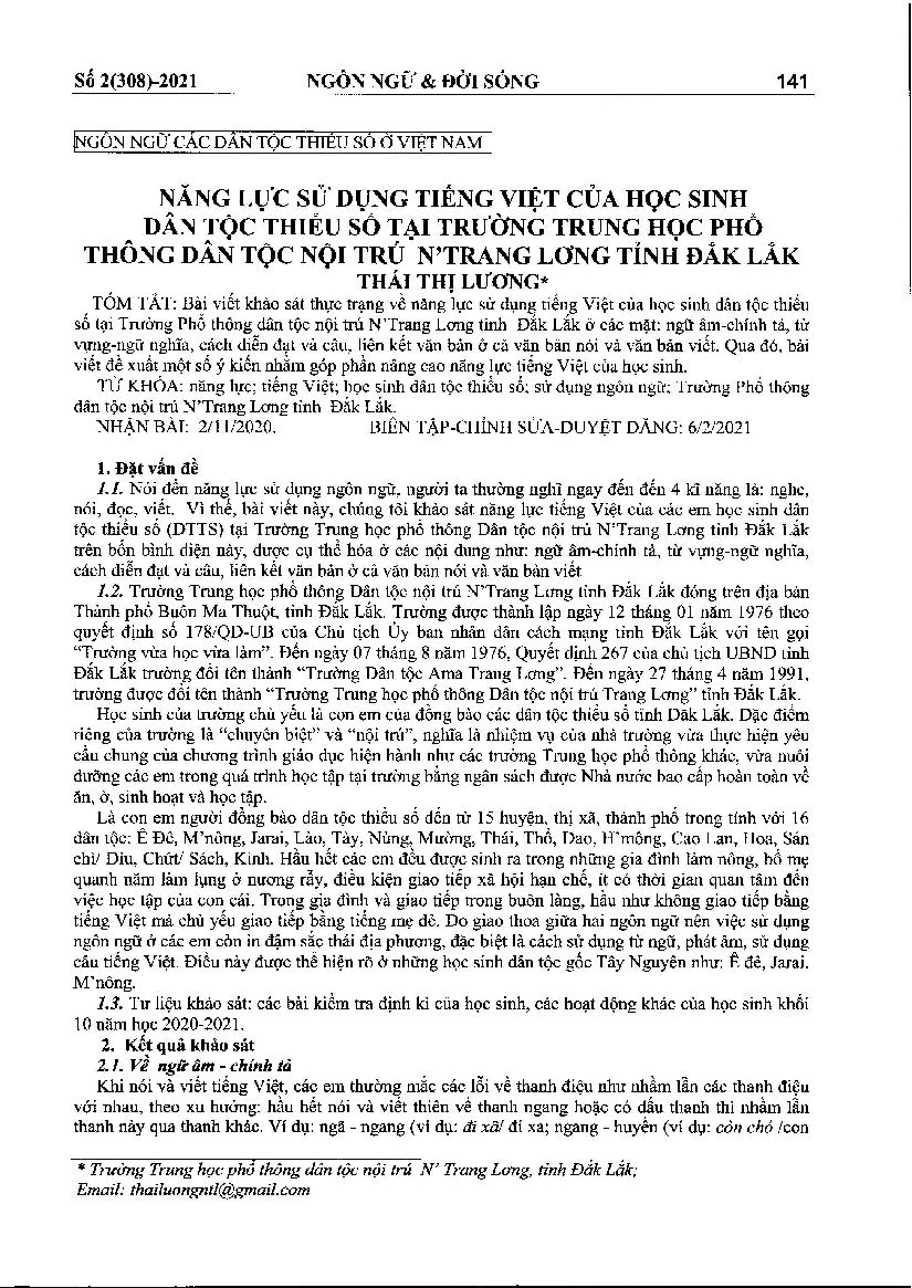 Năng lực sử dụng tiếng việt của học sinh dân tộc thiểu số tại Trường Trung học phổ thông dân tộc nội trú N’Trang Lơng tỉnh Đắk Lắk