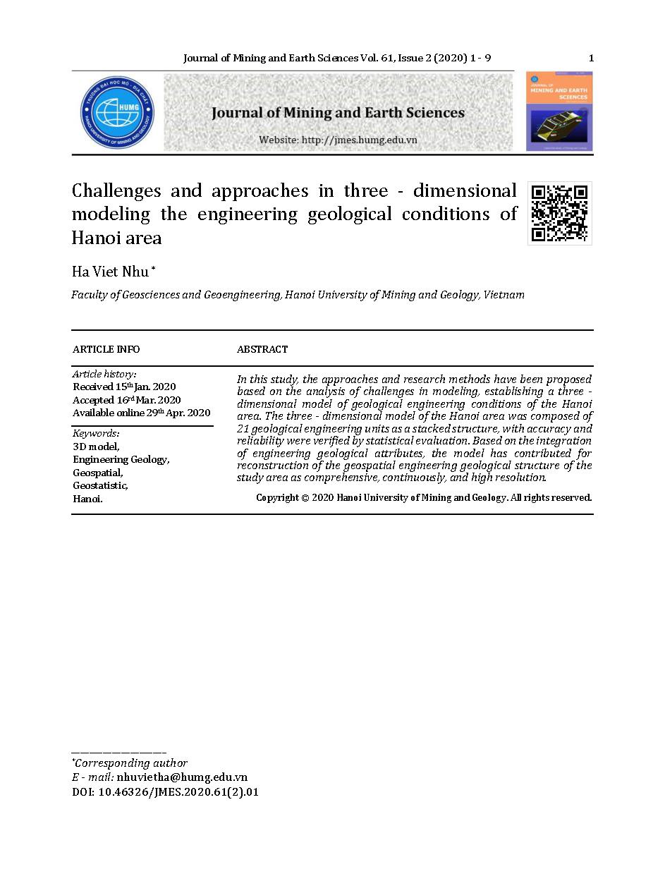 Thách thức và tiếp cận mô hình ba chiều điều kiện địa chất công trình khu vực Hà Nội = Challenges and approaches in three - dimensional modeling the engineering geological conditions of Hanoi area