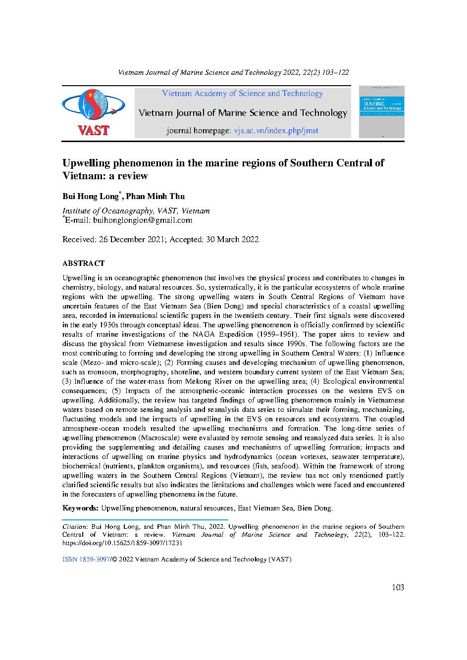Hiện tượng bồi lấp vùng biển Nam Trung Bộ Việt Nam: đánh giá = Upwelling phenomenon in the marine regions of Southern Central of Vietnam: a review