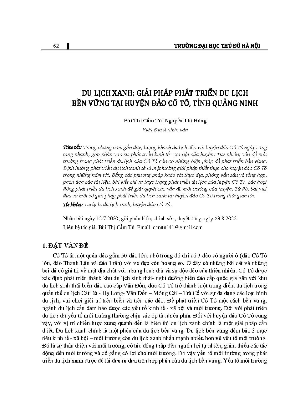 Du lịch xanh: Giải pháp phát triển du lịch bền vững tại huyện đảo Cô Tô, tỉnh Quảng Ninh = Green tourism: Solutions for sustainable tourismdevelopment in Co To island, Quang Ninh province
