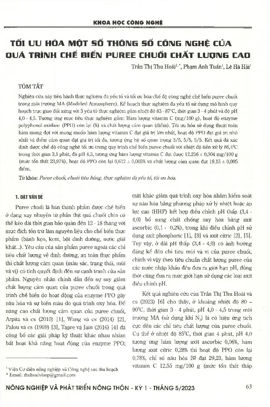 Tối ưu hóa một số thông số công nghệ của quá trình chế biến Puree chuối chất lượng cao = Optimizing some technology specifications of the process of high quality banana puree processing
