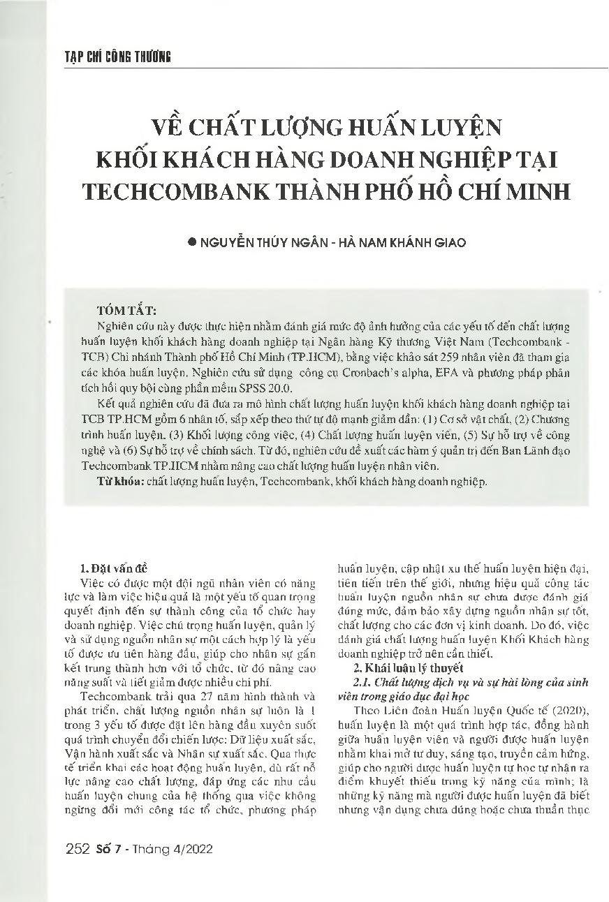 Về chất lượng huấn luyện khối khách hàng doanh nghiệp tại Techcombank Thành phố Hồ Chí Minh = A study on the quality of training services for the department of corporate customers at Techcombank - Ho Chi Minh City Branch