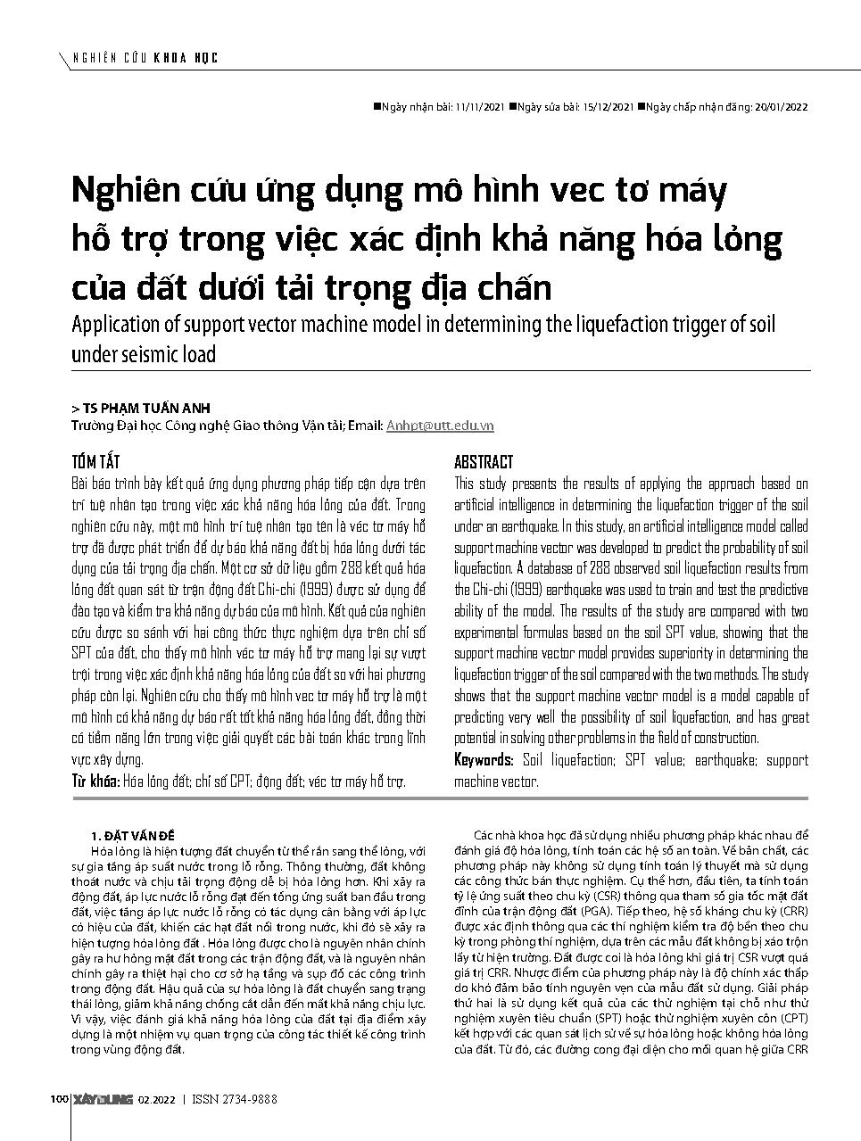 Nghiên cứu ứng dụng mô hình vec tơ máy hỗ trợ trong việc xác định khả năng hóa lỏng của đất dưới tải trọng địa chấn = Application of support vector machine model in determining the liquefaction trigger of soil under seismic load