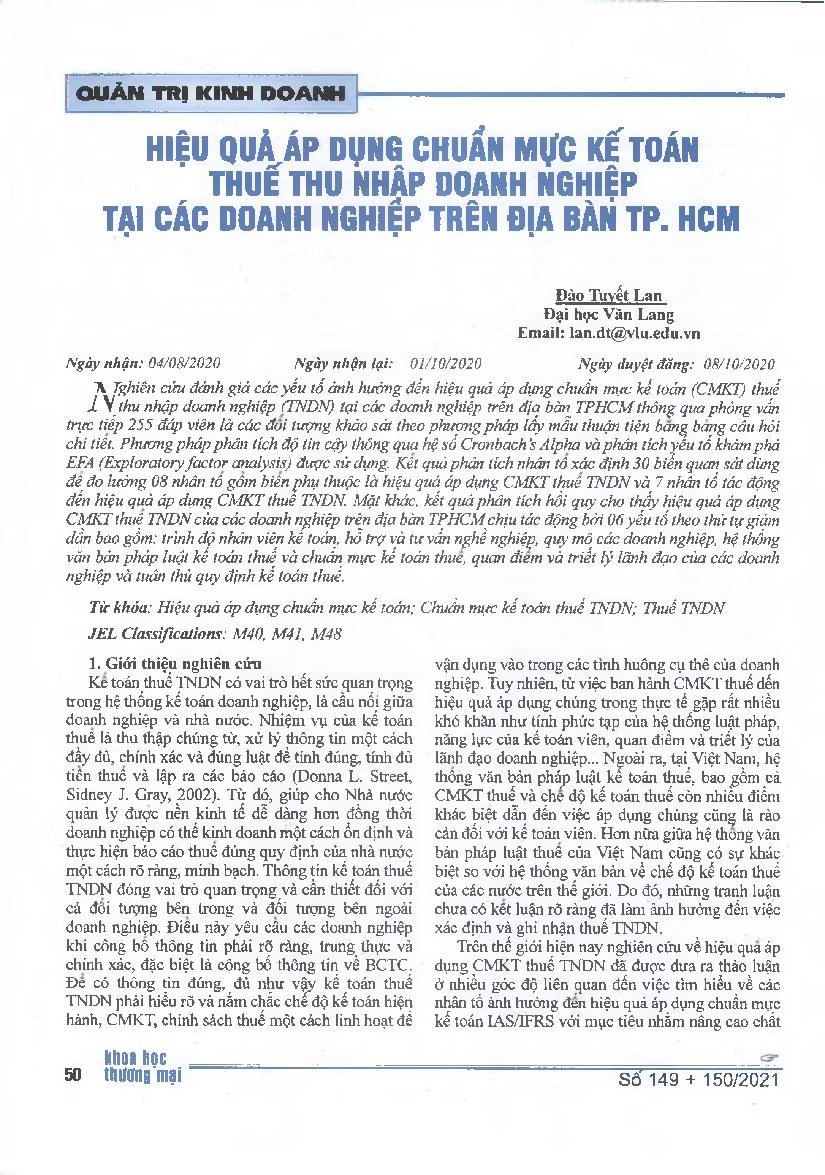 Hiệu quả áp dụng chuẩn mực kế toán thuế thu nhập doanh nghiệp tại các doanh nghiệp trên địa bàn Tp. Hồ Chí Minh = The Efficiency of Corporate Income Tax (CIT) Accounting Standards in Enterprises in Ho Chi Minh