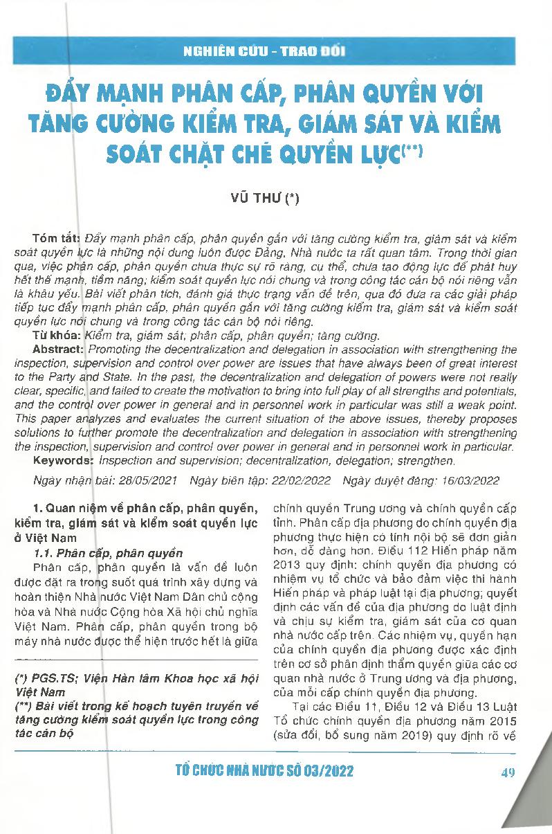 Đẩy mạnh phân cấp, phân quyền với tăng cường kiểm tra, giám sát và kiểm soát chặt chẽ quyền lực = Promoting the decentralization and delegation in association with strengthening the inspection, supervision and strict control over power