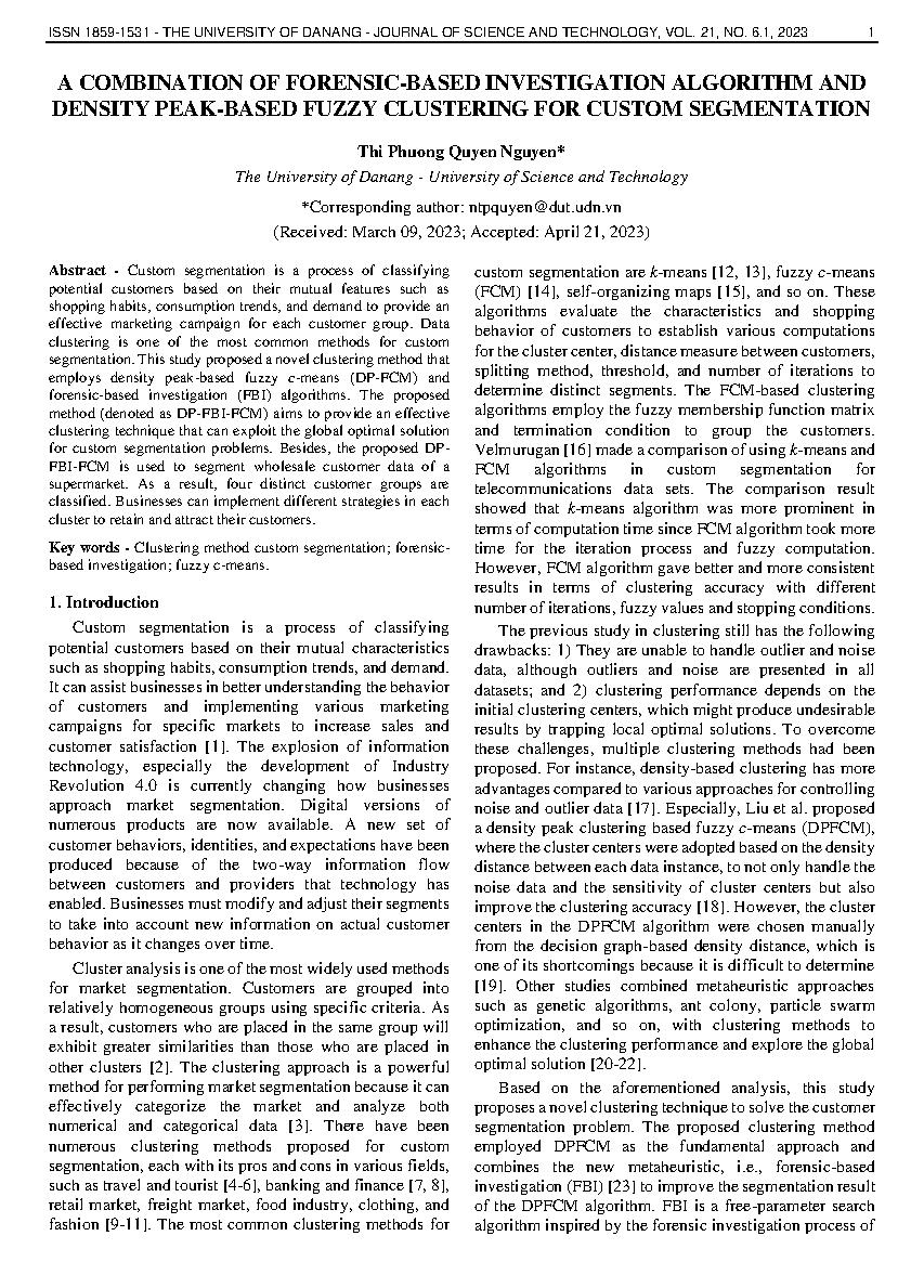 Sự kết hợp giữa thuật toán điều tra dựa trên pháp y và phân cụm mờ dựa trên đỉnh mật độ để phân đoạn tùy chỉnh = A combination of forensic-based investigation algorithm and density peak-based fuzzy clustering for custom segmentation
