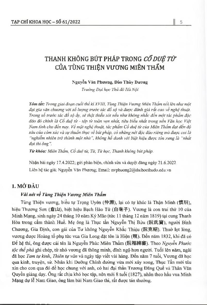 Thanh không bút pháp trong Cổ Duệ Từ của Tùng Thiện Vương Miên Thẩm = The song of Fishermen’s (Co Due Tu) clear and empty in thinking writing technique of Tung Thien Vuong Mien Tham