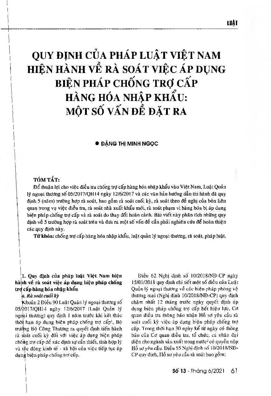 Quy định của pháp luật Việt Nam hiện hành về rà soát việc áp dụng biện pháp chống trợ cấp hàng hóa nhập khẩu: Một số vấn đề đặt ra = Some issues relating to Vietnam's regulations on the review of the anti-subsidy measures application for imported goods