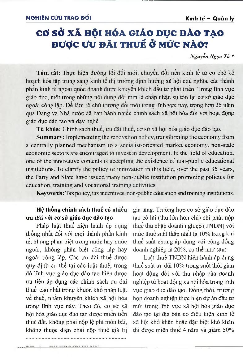 Cơ sở xã hội hóa giáo dục đào tạo được ưu đãi thuế ở mức nào? = Non-public education and training institutions - what are tax the tax incentives?
