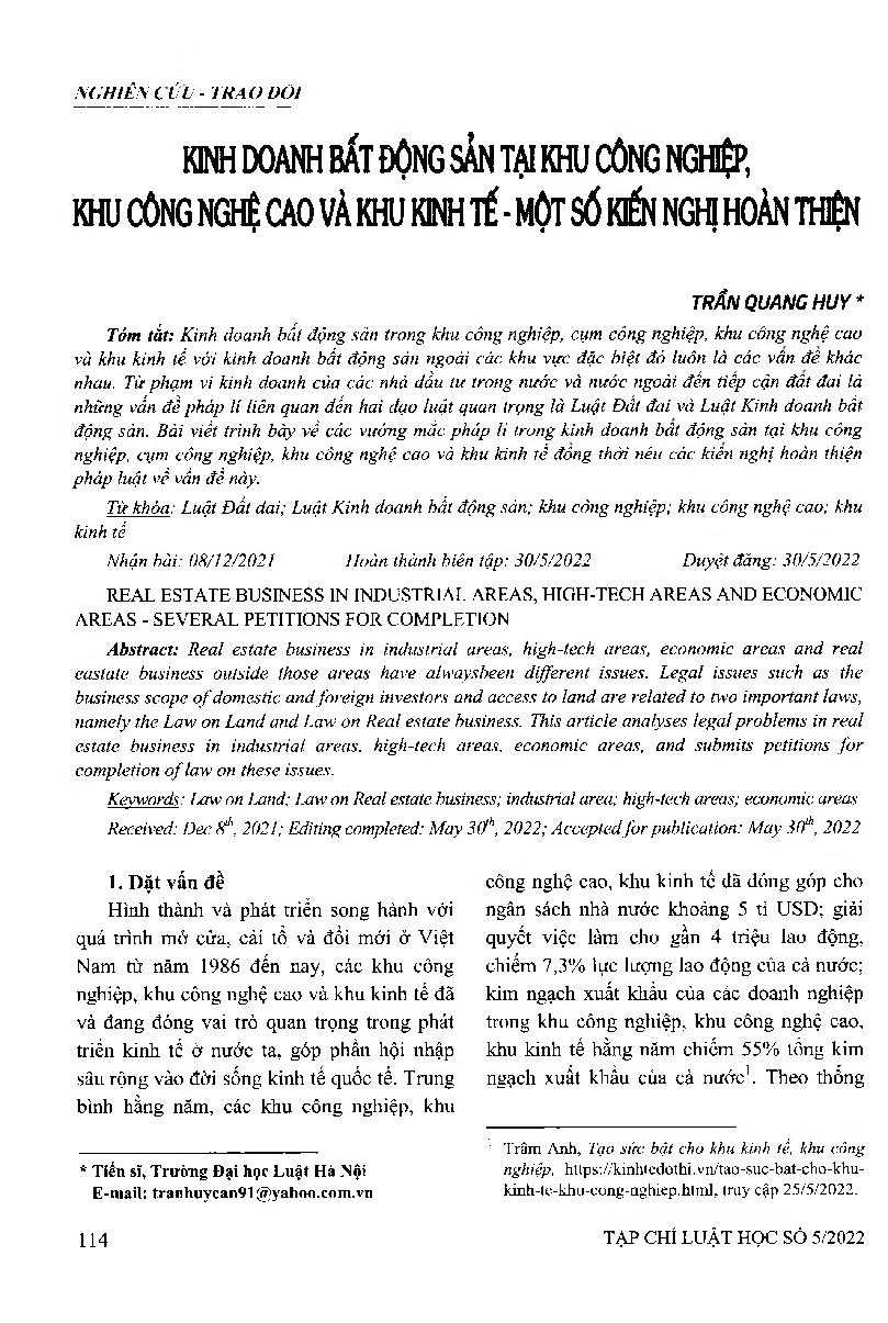 Kinh doanh bất động sản tại khu công nghiệp, khu công nghệ cao và khu kinh tế - Một số kiến nghị hoàn thiện = Real estate business in industrial areas, high-tech areas and economic areas - Several petitions for completion