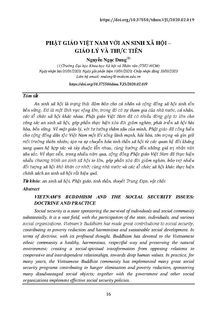 PHẬT GIÁO VIỆT NAM VỚI AN SINH XÃ HỘI – GIÁO LÝ VÀ THỰC TIỄN = VIETNAM’S BUDDHISM AND THE SOCIAL SECURITY ISSUES: DOCTRINE AND PRACTICE