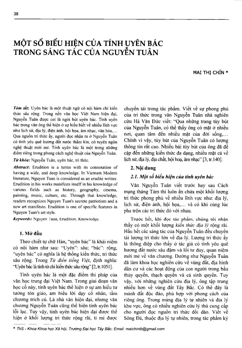 Một số biểu hiện của tính uyên bác trong sáng tác của Nguyễn Tuân = Manifestations of erudition in works by Nguyen Tuan
