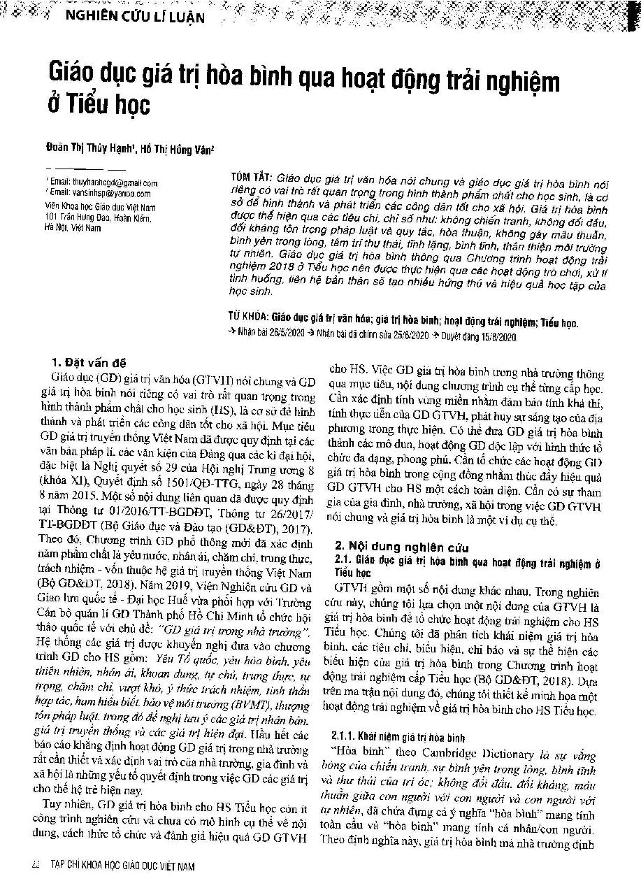 Giáo dục giá trị hòa bình qua hoạt động trải nghiệm ở Tiểu học = Peace value education through experiential activities for primary students