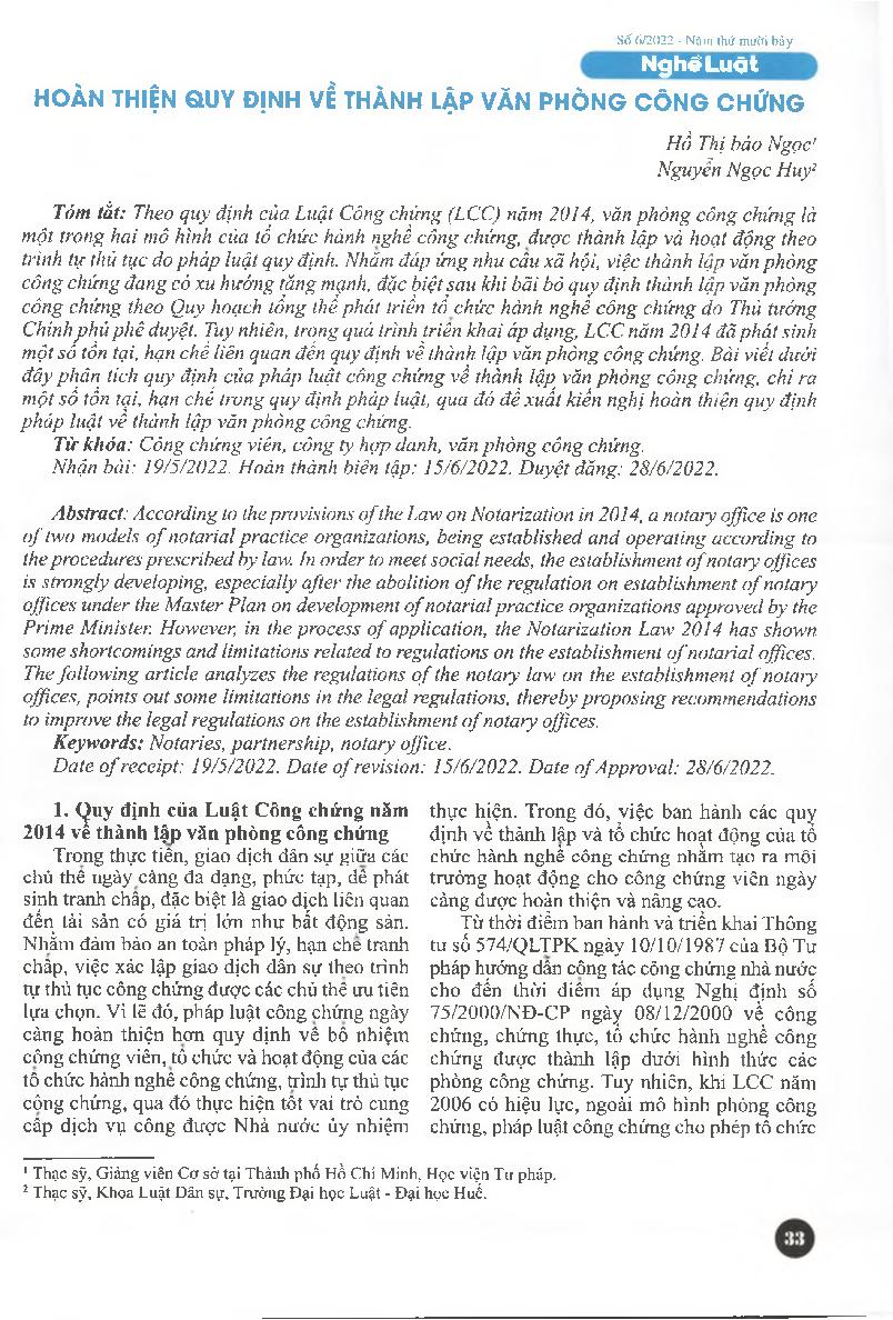 Hoàn thiện quy định về thành lập văn phòng công chứng = Finalization of legal regulations on establishment of notarial office