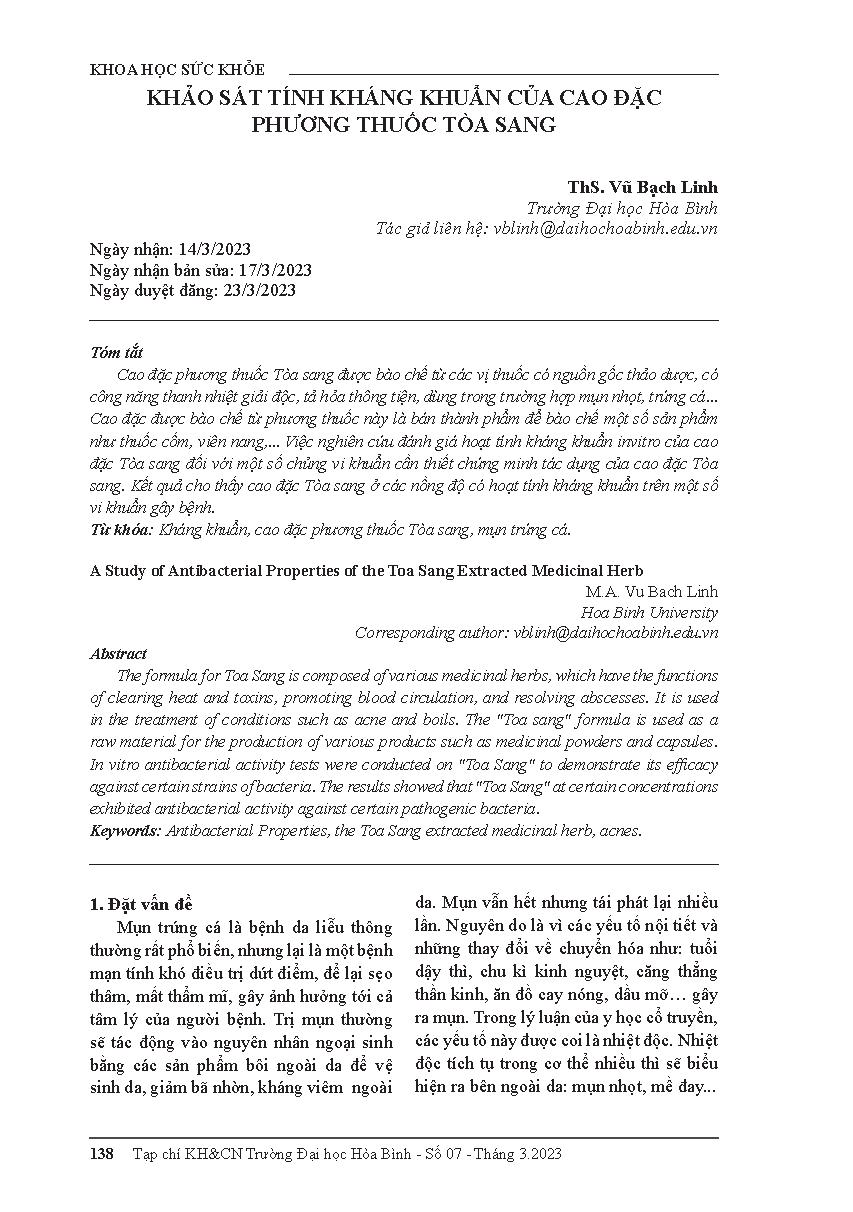 Khảo sát tính kháng khuẩn của cao đặc phương thuốc Tòa sang = A study of antibacterial properties of the Toa Sang extracted medicinal herb