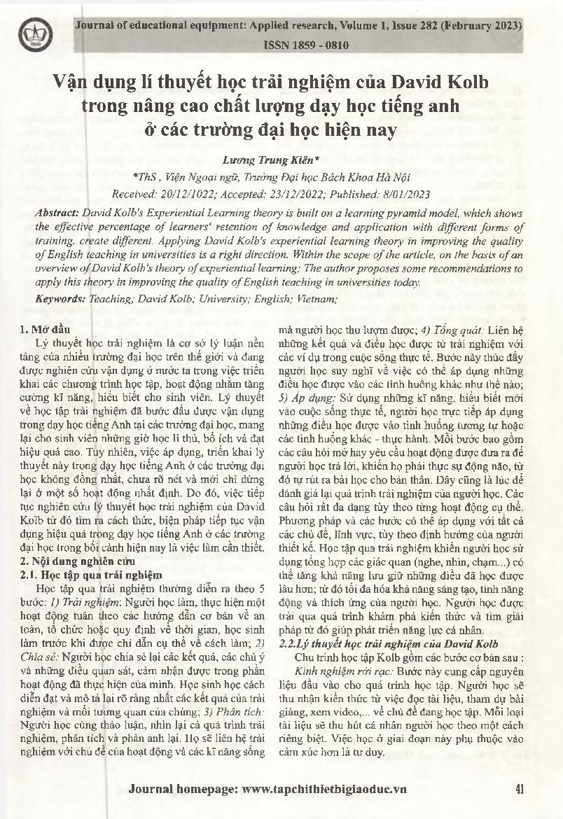 Vận dụng lí thuyết học trải nghiệm của David Kolb trong nâng cao chất lượng dạy học tiếng Anh ờ các trường đại học hiện nay = Applying David Kolb's experiential learning theory to improve the quality of English teaching in higher education