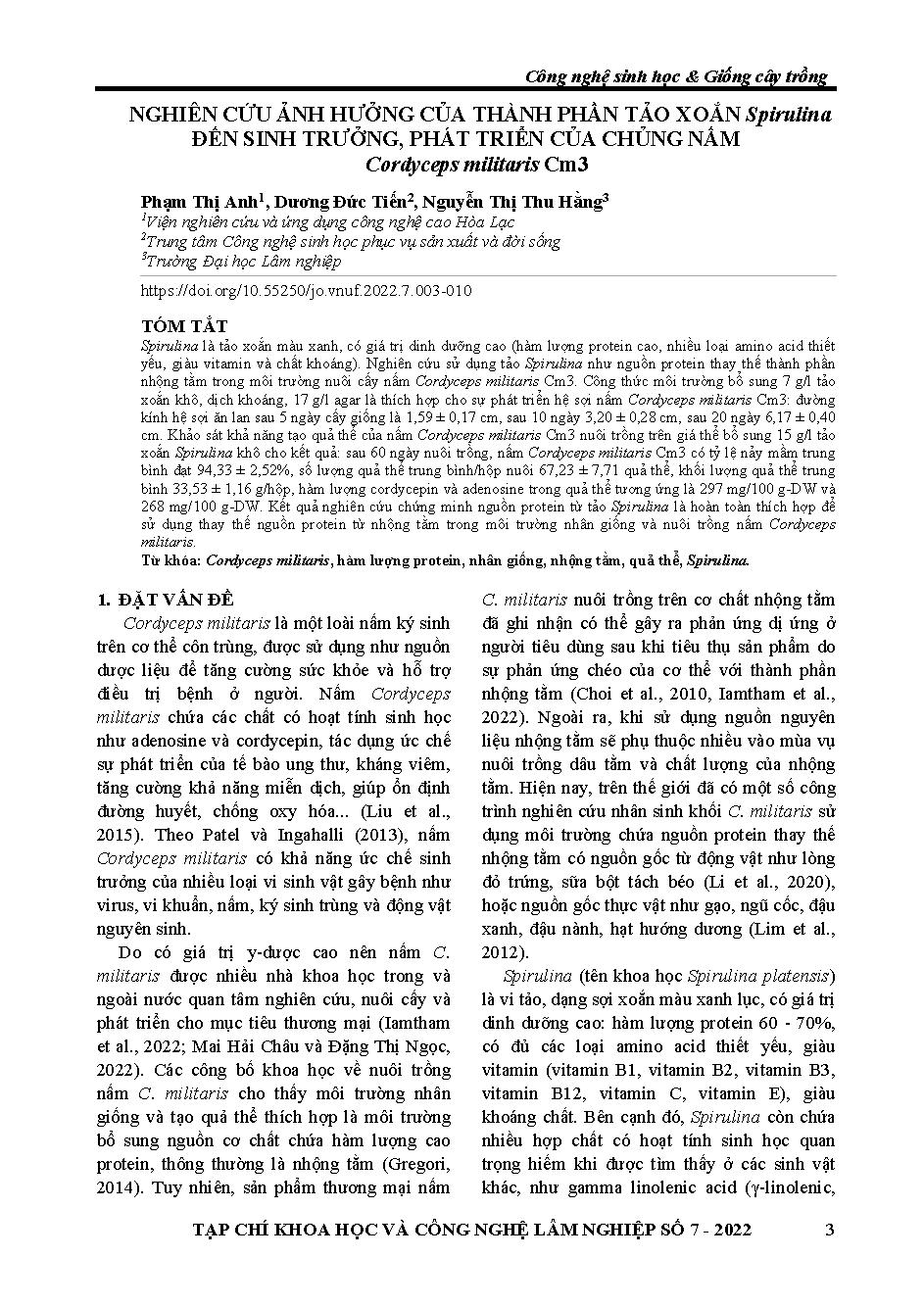 Nghiên cứu ảnh hưởng của thành phần tảo xoắn spirulina đến sinh trưởng, phát triển của chủng nấm cordyceps militaris cm3 = Effects of spirulina ingredients on growth and development of cordyceps militaris cm3