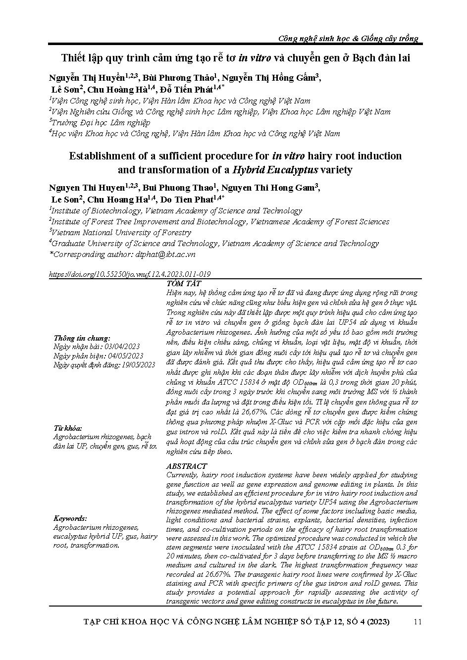 Thiết lập quy trình cảm ứng tạo rễ tơ in vitro và chuyển gen ở Bạch đàn lai = Establishment of a sufficient procedure for in vitro hairy root induction and transformation of a Hybrid Eucalyptus variety