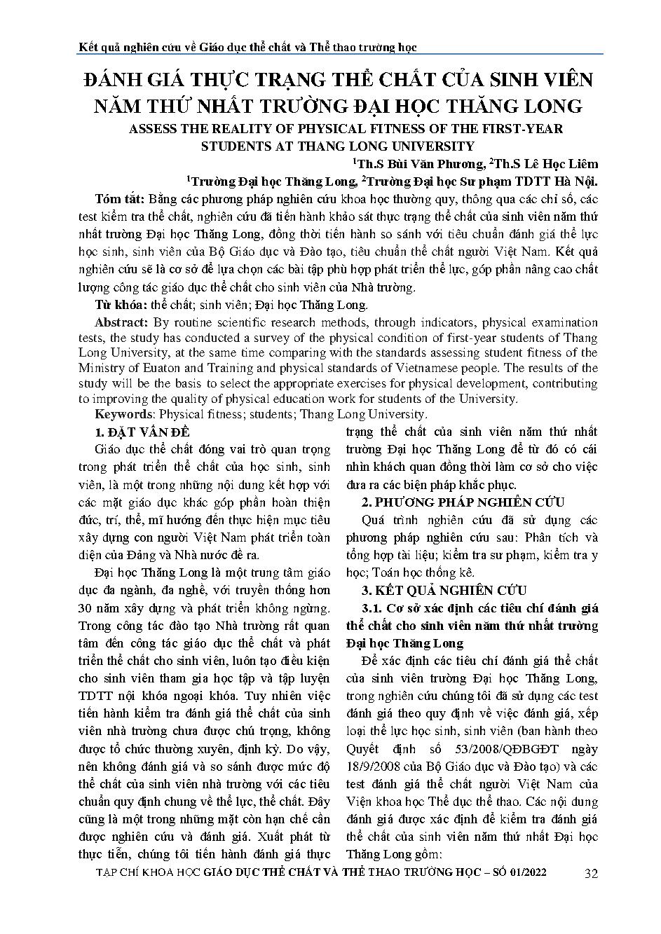 Đánh giá thực trạng thể chất của sinh viên năm thứ nhất trường Đại học Thăng Long = Assess the reality of physical fitness of the first-year students at Thang Long University