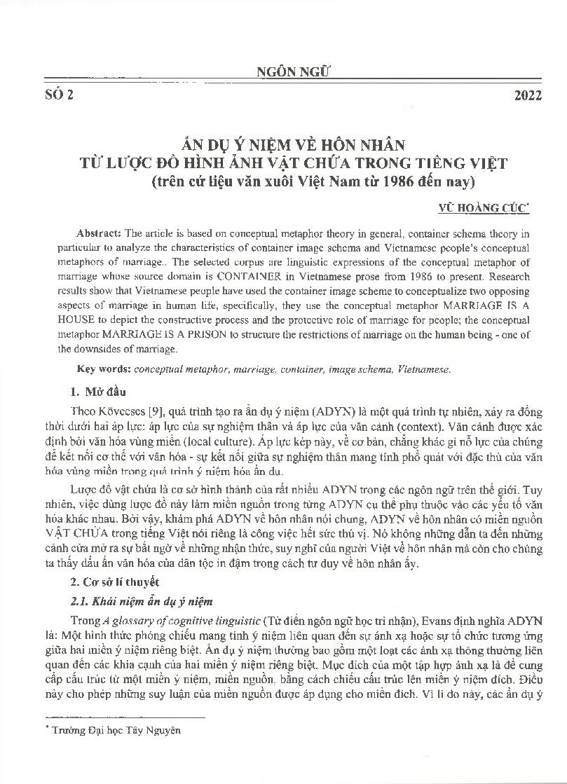 Ẩn dụ ý niệm về hôn nhân từ lược đồ hình ảnh vật chứa trong tiếng Việt (trên cứ liệu văn xuôi Việt Nam từ 1986 đến nay) = Conceptual metaphors of marriage from image schema container in Vietnamese (Based on Vietnamese prose data from 1986 to present)