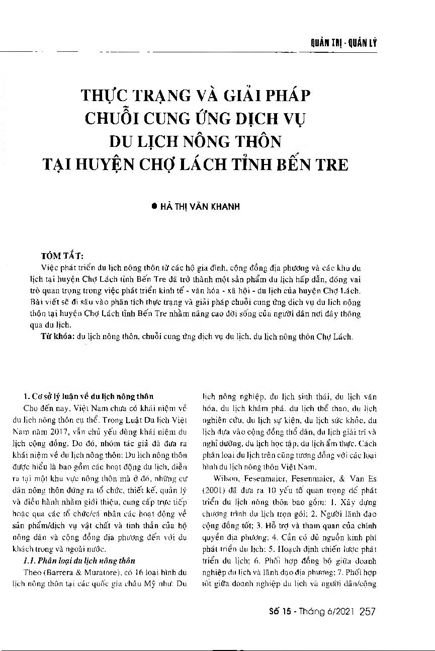 Thực trạng và giải pháp chuỗi cung ứng dịch vụ du lịch nông thôn tại huyện Chợ Lách, tỉnh Bến Tre = Current situation and solutions for the supply chain of rural tourism services in Cho Lach District, Ben Tre Province