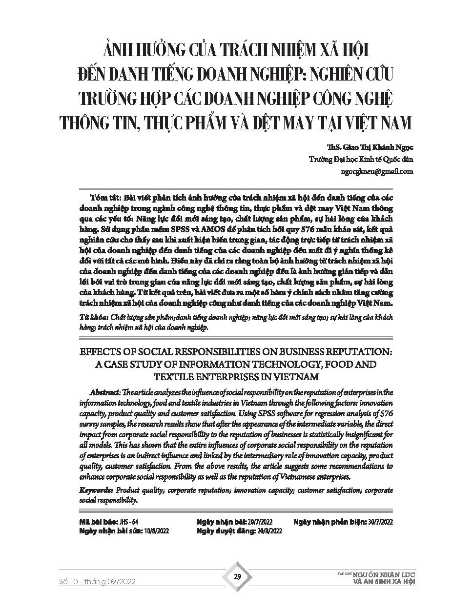 Ảnh hưởng của trách nhiệm xã hội đến danh tiếng doanh nghiệp: Nghiên cứu trường hợp các doanh nghiệp Công nghệ thông tin, Thực phẩm và Dệt may tại Việt Nam = Effects of social responsibilities on business reputation: A case study of Information Technology