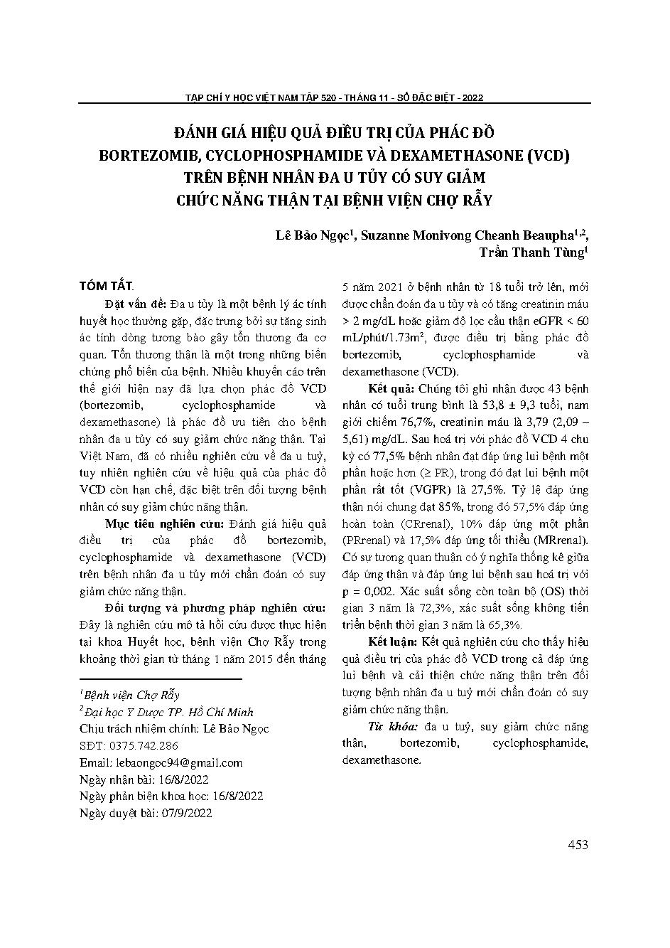 Đánh giá hiệu quả điều trị của phác đồ Bortezomib, Cyclophosphamide và Dexamethasone (VCD) trên bệnh nhân đa u tủy có suy giảm chức năng thận tại Bệnh viện Chợ Rẫy = Evaluating the treatment efficacy of Bortezomib, Cyclophosphamide and Dexamethasone (VCD)