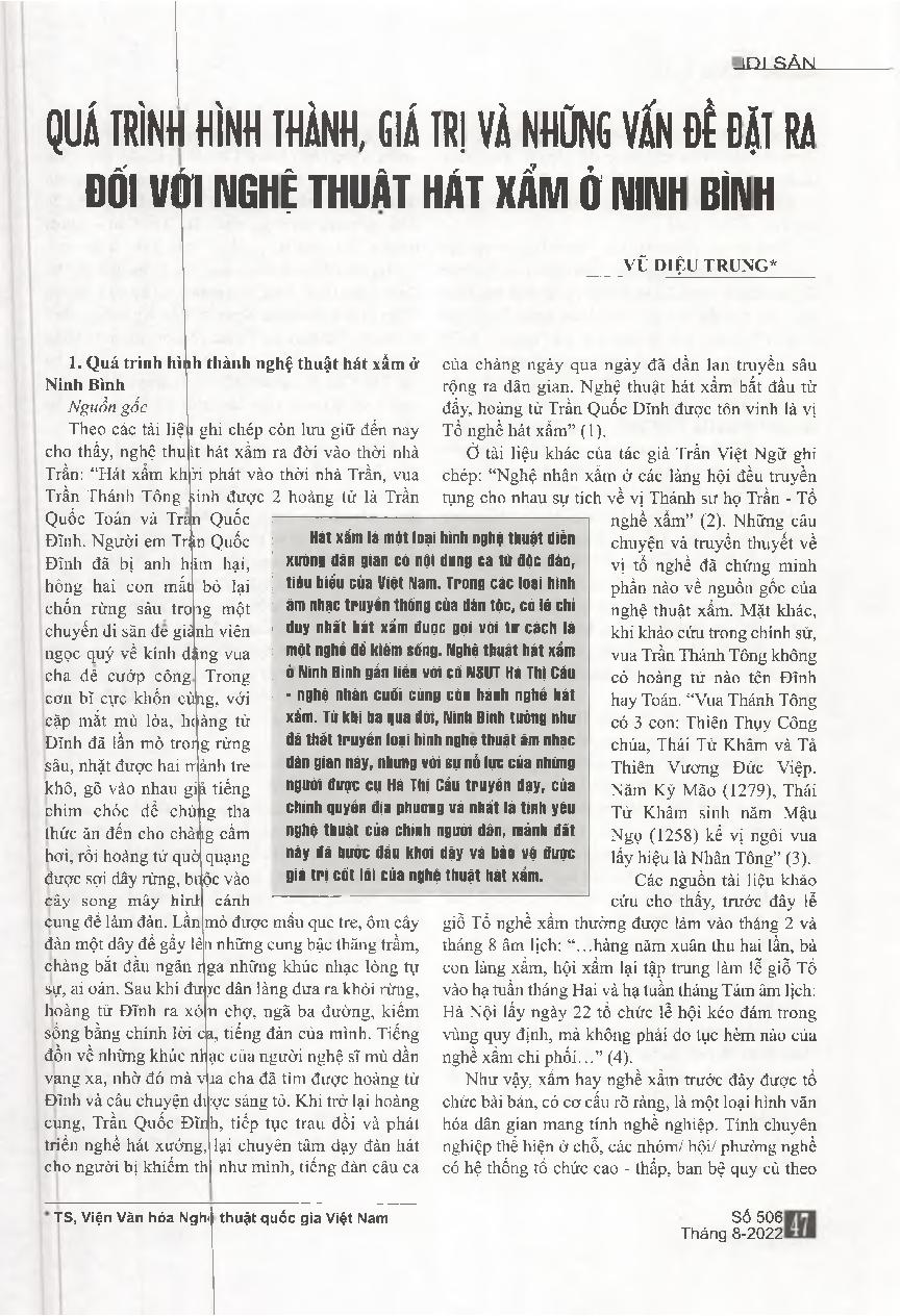 Quá trình hình thành, giá trị và những vấn đề đặt ra đối với nghệ thuật hát xẩm ở Ninh Bình = Formation process, values and problems for Xam singing in Ninh Binh