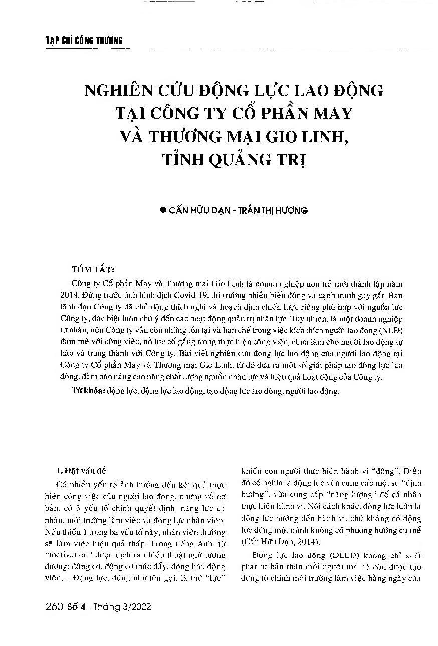 Nghiên cứu động lực lao động tại công ty cổ phần May và Thương mại Gio Linh, tỉnh Quảng Trị = A study on the work motivation of employees at Gio Linh Garment and Trading Joint stock Company, Quang Tri province