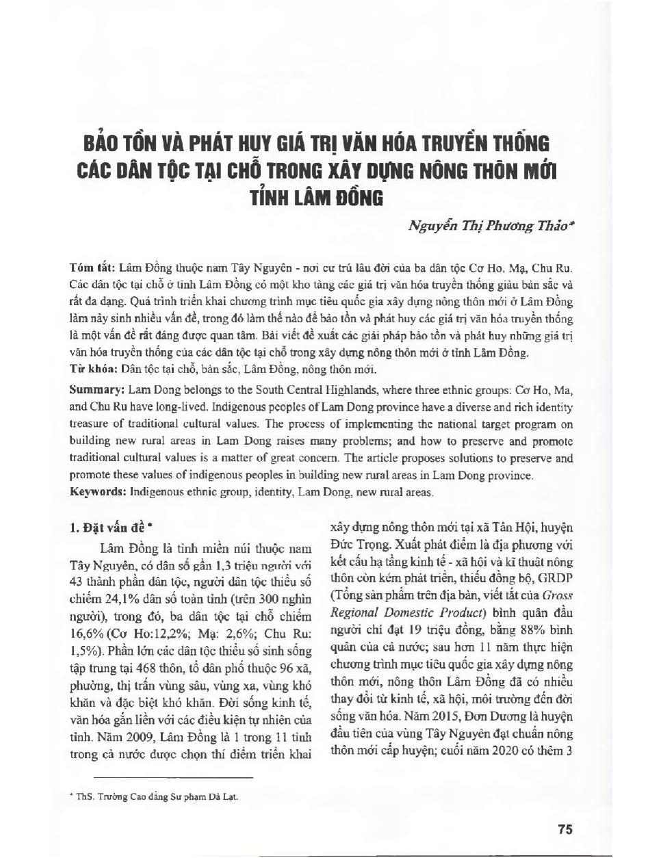 Bảo tồn và phát huy giá trị văn hóa truyền thống các dân tộc tại chỗ trong xây dựng nông thôn mới tỉnh Lâm Đồng = Preserving and promoting traditional cultural values of local ethnic groups in the construction of new rural areas in Lam Dong province