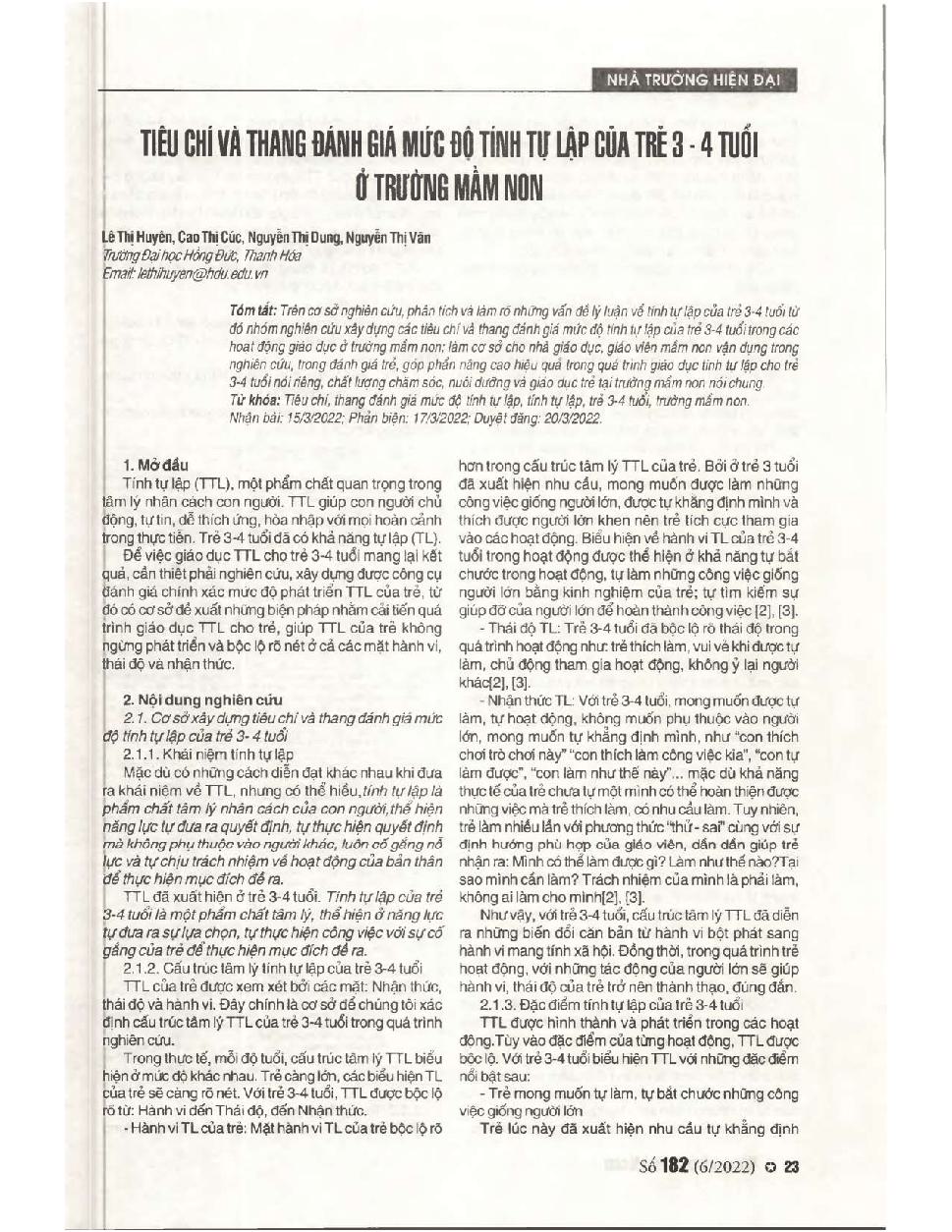 Tiêu chí và thang đánh giá mức độ tự lập của trẻ 3-4 tuổi ở trường mầm non = Criteria and scale to assess the level of independence of 3-4 years old children in preschool