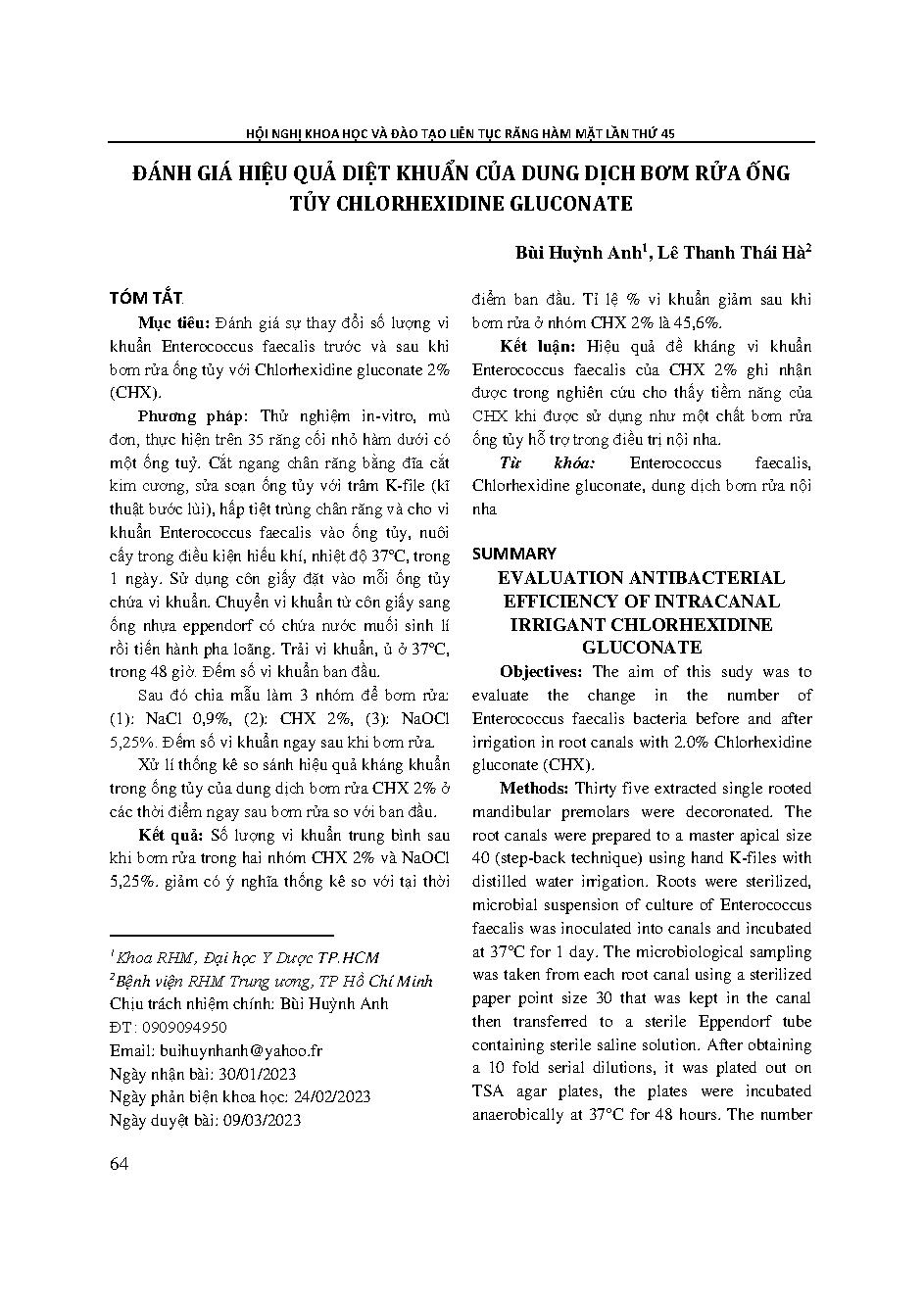 Đánh giá hiệu quả diệt khuẩn của dung dịch bơm rửa ống tủy chlorhexidine gluconate