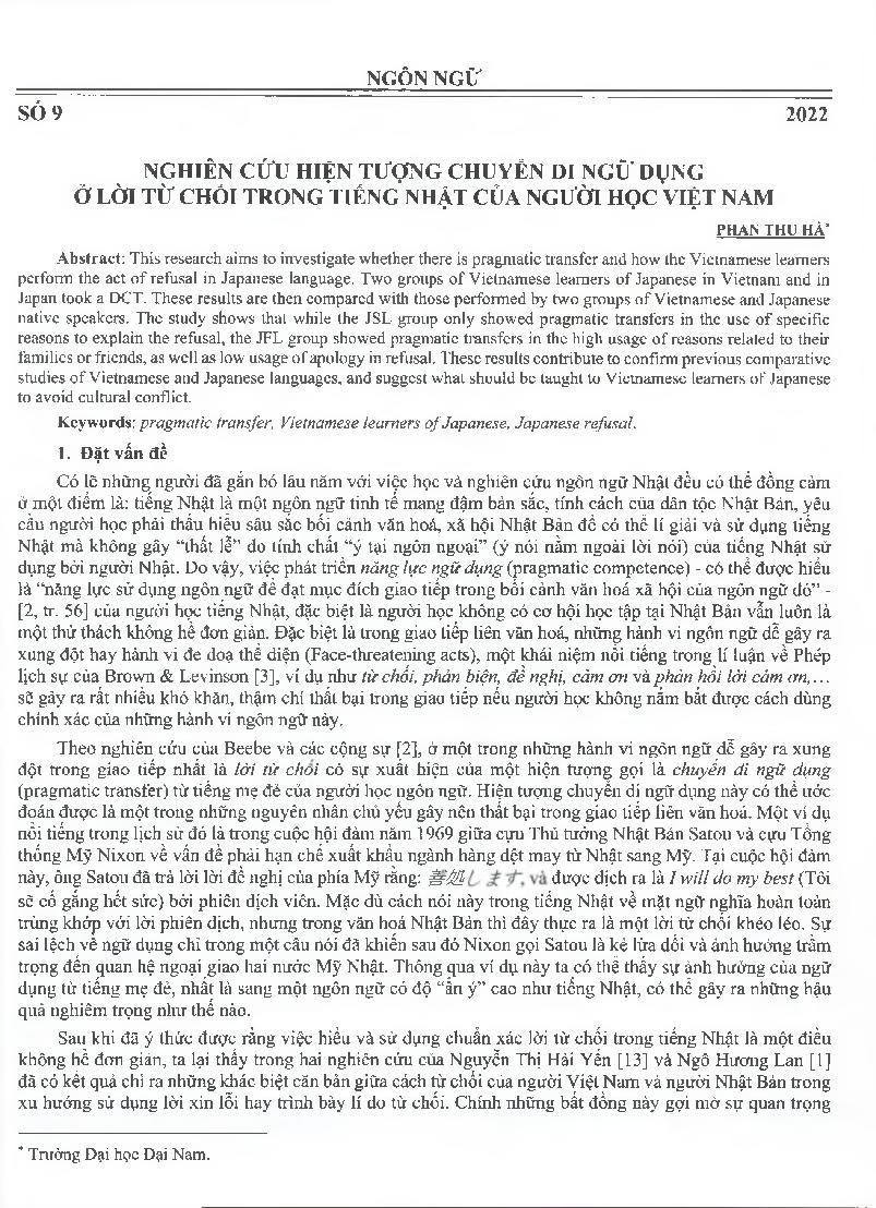 Nghiên cứu hiện tượng chuyển di ngữ dụng ở lời từ chối trong tiếng Nhật của người học Việt Nam = Pragmatic transfer in refusal speech act in Japanese of Vietnamese learners